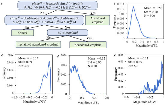 Figure 5. A knowledge-based framework used to identify cropland abandonment. (a) Decision tree for abandoned cropland and reclaimed abandoned cropland identification. Class represents the type of curve fit, and M s e and D s e represent the magnitude and duration of the fitted curve, respectively (see Table 2 for details on the meaning of the different fitting types). LC is the land cover type at the end of the period. The superscripts of the parameters represent the different end-element types. (b,c) Histogram of the magnitude of change in SL and GV endmembers derived from the interest area of cropland abandonment selected from Google Earth historical imagery, respectively. (d,e) Histogram of the magnitude of change in SL and GV endmembers derived from the interest area of reclaimed abandoned cropland and natural vegetation-covered abandoned cropland selected from Google Earth historical imagery, respectively.