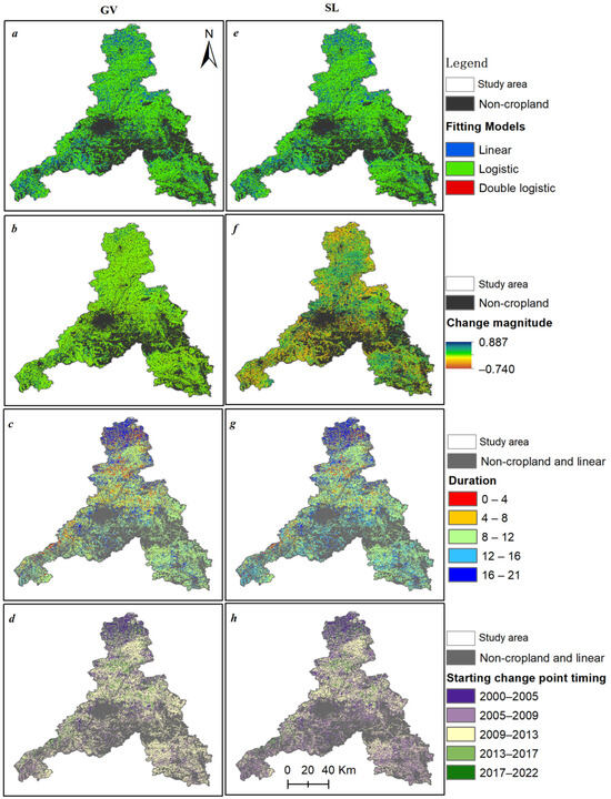 Figure 7. Parameters for fitting the GV and SL fraction time series. (a,e) Spatial distribution of fitting models for GV and SL masked by non-cropland. (b,f) The change magnitudes of GV and SL masked by non-cropland. (c,g) The change duration of logistic and double-logistic models. (d,h) Starting change point timing of GV and SL masked by non-cropland and the zone of fitted linear models.