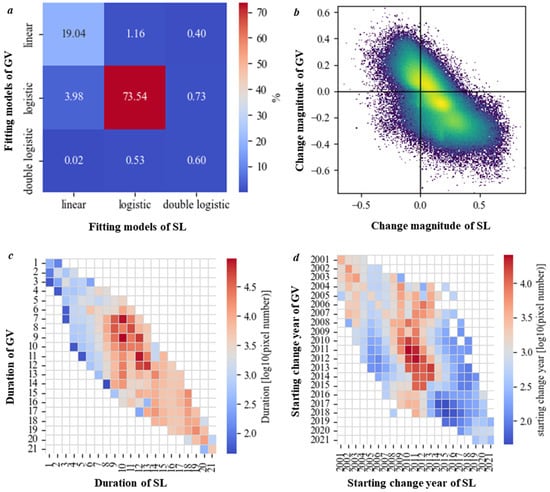Figure 8. Relationship of fitted parameters between GV and SL series. (a) Heatmap of the confusion matrix used to represent the spatial correspondence between the GV and SL time series fit model types. (b) Scatter density plots used to represent the spatial correspondence between the magnitude of changes in the GV and SL time series, where blue to yellow represents an increase in scatter density. (c,d) Two-dimensional histograms (the size of the bin is 1 year) representing the relationship between the duration and starting change year of GV and SL, respectively.