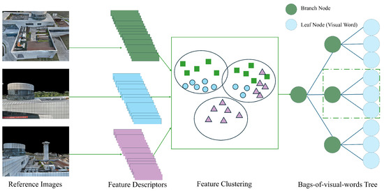 where and represent the sets of feature descriptors and the corresponding centers obtained by clustering F into k clusters using the K-Means algorithm, and is the center of F. In the constructed optimal bag-of-words tree for the reference images, the total number of leaf nodes is . For any leaf node , a unique node ID can be determined. For the feature descriptors of an image I, i.e., for all , let the leaf node retrieved by traversing the K-ary tree be . We use the node ID of as the visual word representation of d. By mapping the feature descriptors of the image I accordingly and counting the histogram of visual words, the bag-of-words representation of the image I is obtained: