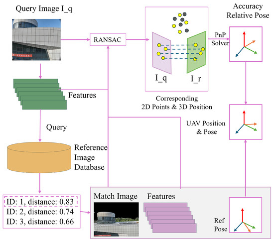A reference image database is utilized to find the most corresponding image of query image . After using RANSAC algorithm to remove miscorresponding 2D points of and , PnP solver is used to obtain the accuracy relative pose so that the accuracy position of the UAV can be easily obtained.