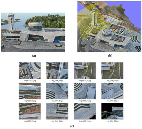We utilized the DJI Mavic 3E drone to capture the Intelligent Unmanned System Testing Base of the Chibi Pilot Valley in Xianning City, Hubei Province, to obtain our 3D geometric model. For the specified test scenario, a 3D reconstruction method [35] was employed, with the geometric model’s accuracy around 0.05 m. Subsequently, 114 effective viewpoints were generated using the method in Section 3.1, and synthetic images were rendered using OpenGL. The 3D geometric model, optimal coverage viewpoints, and reference images are shown in Figure 8a, Figure 8b, and Figure 8c, respectively.