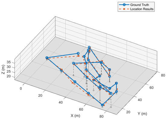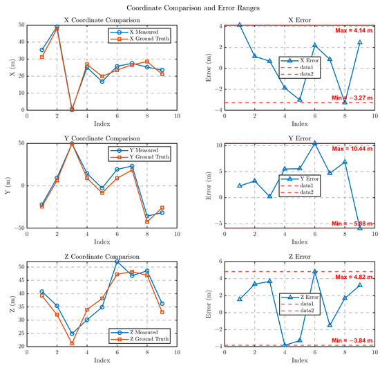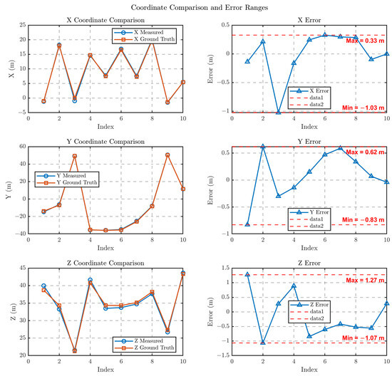To verify the accuracy of the proposed algorithm, the drone captures a set of photos at different locations. During the image capture process, the drone’s position is obtained using real-time dynamic carrier phase difference technology (RTK). The drone’s self-positioning coordinates are calculated in real-time using the proposed algorithm. This method allows for positioning accuracy without relying on the GNSS, achieving accuracy within 1–5 m. The RTK and proposed algorithm’s positioning coordinates and errors in the X, Y, and Z directions at different positions are plotted in Figure 10 and Figure 11.