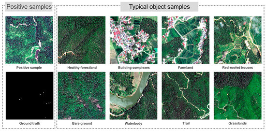 Based on data from 119 ground survey points in Nanping City, Fujian Province, provided by the Forest and Grassland Pest Control Center of the National Forestry and Grassland Administration, visual interpretation standards for trees infected with pine wilt disease were established. Diseased tree crowns typically appear orange-red, bright red, or reddish-brown, with shapes resembling circles or ellipses (distinguishable from bare land based on shape characteristics). They are relatively scattered in distribution, with only occasional clusters of multiple diseased trees. Their texture is distinct, and due to lighting effects, areas of brightness and shadow can be observed. In contrast, healthy tree crowns appear bright green or dark green, with dense and aggregated foliage. The visual interpretation of diseased trees was conducted in ArcGIS Pro. To improve the model’s generalization ability, additional typical object samples were included, such as water bodies, farmland, building complexes, healthy forests, grasslands, red-roofed houses within forests, and forest trails. Examples of the dataset samples are shown in Figure 3.