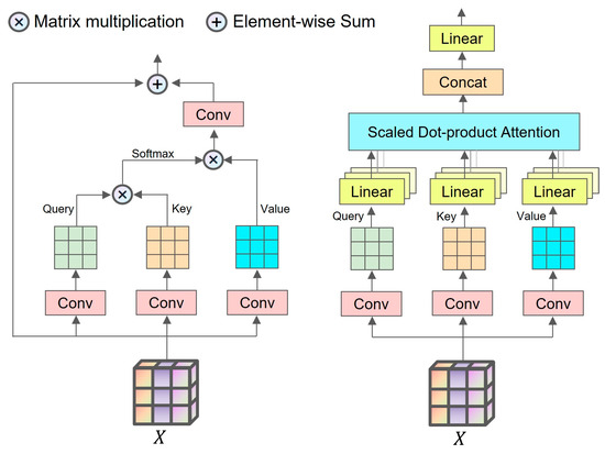 The principle of the self-attention algorithm is to compute the degree of association between each element in the input sequence and other elements through query and key vectors, then perform a weighted sum of value vectors based on these associations. This generates a new representation of the sequence, capturing both short-term and long-term dependencies within the sequence. In the field of image processing, self-attention algorithms can be divided into single-head attention and multi-head attention. The core idea of single-head attention is to establish the dependency relationship between each element in the feature map along a specific dimension. Multi-head attention, on the other hand, uses multiple single-head attention mechanisms to perform self-attention calculations on the input tensor separately. The results of these multiple attention heads are then fused and output (Figure 4). Compared to single-head attention, multi-head attention outputs a richer and more complex result, as it integrates information from multiple subspaces, enhancing the feature extraction ability. In this study, various forms of self-attention algorithms are systematically introduced into the field of pine wilt disease satellite monitoring, exploring their effectiveness and performance characteristics in this specific application.