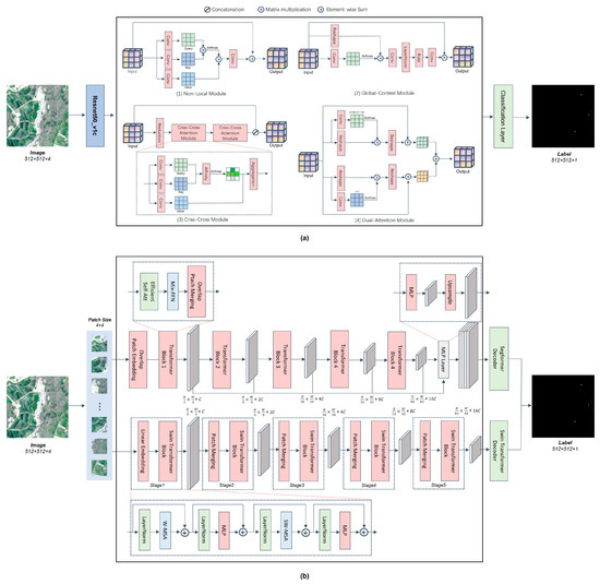 This study employed the open-source model training framework MMSegmentation [33] for transfer learning. MMSegmentation is an open-source toolbox that provides a unified framework for model implementation and evaluation in semantic segmentation tasks. The open-source scripts were first modified to support the training and inference of multi-band imagery. Within the customized MMSegmentation framework, we implemented single-head attention models, including NLNet, CCNet, DANet, and GCNet, as well as multi-head attention models, such as Swin Transformer-T, SegFormer-b0, and SegFormer-b2. Additionally, the classical fully convolutional network (FCN) was implemented as the baseline to evaluate the performance of the attention-based models.
