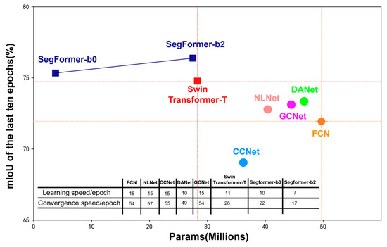 A performance scatter plot was generated based on model parameter size and recognition accuracy to analyze the efficiency of the different models (Figure 6). In this plot, points closer to the upper-left corner represent better-performing models, as they achieve a higher recognition accuracy with fewer parameters. To facilitate comparison across different model types, a vertical and a horizontal reference line were drawn through the scatter points of the baseline model FCN and the least accurate multi-head attention model, Swin Transformer-T, respectively. Models located in the upper-left region relative to this reference point exhibit a superior performance. It was observed that all multi-head attention models were positioned above and to the left of the single-head attention models and the baseline, indicating that multi-head attention models are generally more efficient. Among the single-head attention models, all except CCNet outperformed the baseline FCN.
