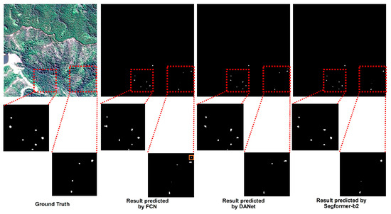 In high-resolution satellite imagery, forest scenes are highly complex, and the visual characteristics of different infected trees within the same image patch often vary. For instance, differences in the severity of infection lead to varying degrees of reflectance changes: in the early stage of pine wilt disease, the changes in canopy reflectance are subtle and difficult to detect; dead trees appear with dim coloration and are also challenging to identify; trees in the mid-to-late stages of infection exhibit the most pronounced reflectance variations and are therefore the easiest to recognize. In addition, infected trees vary in height and crown width—trees with a lower height and smaller crowns are more susceptible to shadow effects from neighboring trees, which results in reduced reflectance. Moreover, bare ground within forests tends to exhibit spectral and textural characteristics in the visible bands that are similar to those of trees in the early or mid-infection stages. Due to these interfering factors and the limited receptive field, CNNs are easily influenced by local features, leading to missed or wrong detections. In contrast, the self-attention mechanism can capture infected tree features at a global level, making it less susceptible to local interference. As a result, self-attention exhibits superior capability in modeling infected tree features. This is evident in the smoother morphology and significantly fewer wrong detections observed in masks extracted by DANet and SegFormer, compared to those produced by FCN.