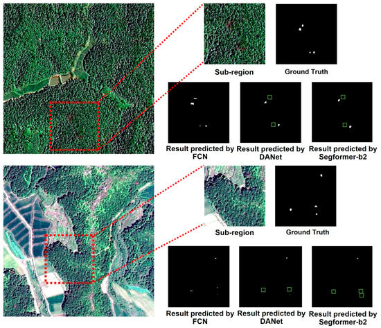 In satellite imagery, the crown width of trees infected by pine wilt disease typically spans fewer than ten pixels (approximately 8 m), which qualifies them as small targets relative to the 512 × 512 image patch size. Affected by the infection severity, tree height, crown size, and surrounding environmental conditions such as shadow and bare ground, the feature saliency of different diseased trees within the same patch varies considerably. In general, infected trees with more pronounced spectral changes, larger crown areas, and less interference from surrounding features exhibit stronger feature saliency. The study finds that self-attention-based models perform exceptionally well in detecting such highly salient infected trees. However, they struggle to allocate sufficient attention to trees with weaker feature saliency, resulting in missed detections (Figure 8). This explains why the SegFormer model, which relies entirely on self-attention, produces significantly more missed detections than FCN. DANet, although hybrid in design, also exhibits varying degrees of omission. To overcome this limitation, we suggest utilizing more extensive and higher-quality datasets to enhance the training of self-attention models, or alternatively, designing dedicated detection networks specifically for pine wilt disease.