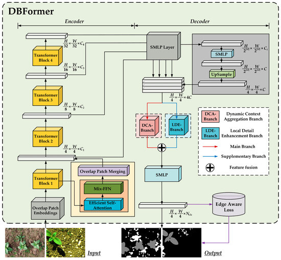 Aiming to achieve precise fine-grained weed segmentation in remote sensing imagery, DBFormer is designed to satisfy several key objectives simultaneously. Firstly, it must model global contextual information. Since the distribution patterns of weeds are influenced by field conditions and crop growth stages, relying solely on local features makes it difficult to accurately distinguish weeds from crops. Therefore, the model must be capable of extracting global information from large-scale images, encompassing the background environment, vegetation distribution patterns, and the relationships between multi-scale features, to enhance overall segmentation stability. Secondly, it is essential to preserve local detail features. Weeds in agricultural fields typically exhibit complex morphological characteristics—such as slender leaves and small vegetation clusters—that are prone to being lost during global feature extraction. Thus, while focusing on global information, the model must accurately capture local texture and edge details to ensure precise identification of small weed targets, thereby improving segmentation accuracy and robustness. Finally, maintaining the integrity and clarity of boundaries is crucial. Due to the morphological similarities between weeds and crops, combined with challenges such as illumination variations and shadow interference in remote sensing imagery, target boundaries may become blurred or fragmented. Consequently, the segmentation model must enhance its capability to extract boundary features; this results in segmentation outputs which are more complete and with clear boundaries, which in turn minimizes the confusion between crops and weeds and provides high-quality data support for precision agriculture management. Based on these objectives, we propose a novel approach—DBFormer—which integrates a dynamic context aggregation branch (DCA-Branch), a local detail enhancement branch (LDE-Branch), and a global–local feature fusion strategy. This design not only reinforces global feature modeling but also effectively preserves local details and boundary information. The following sections provide a detailed description of the design philosophy of DBFormer and its application in weed segmentation within remote sensing imagery.