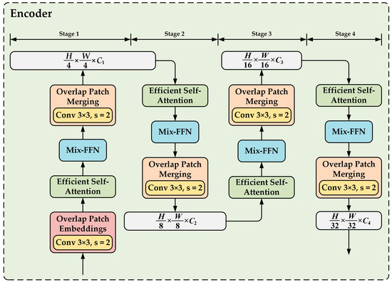 The model encoder MEncoder employs a hierarchical Transformer-based architecture, which consists of overlap patch embeddings and four stages (Stage1, Stage2, Stage3, and Stage4), as illustrated in Figure 3. This encoder progressively extracts features from the input image while compressing its spatial dimensions, thereby generating encoded features that encapsulate multi-scale information.