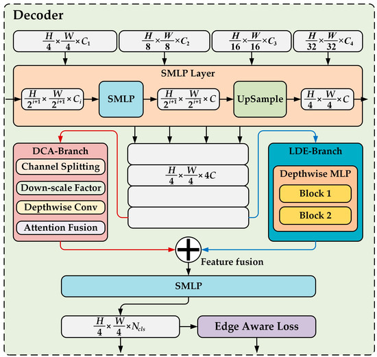 Corresponding to the encoder MEncoder, the decoder receives multi-scale feature inputs from the encoder and progressively performs feature upsampling, fusion, and refinement. The decoder is also divided into several stages, including the SMLP stage, the dynamic context aggregation branch (DCA-Branch), the feature fusion with local detail enhancement branch (LDE-Branch), the Edge-Aware Loss, and the output stage, as shown in Figure 4. Its primary objective is to preserve global contextual information while accentuating local detail features, thereby achieving precise segmentation of fine-grained weeds in remote sensing imagery.