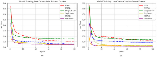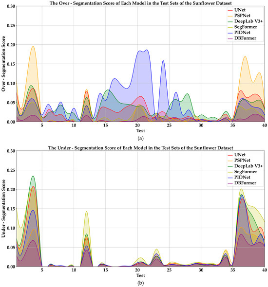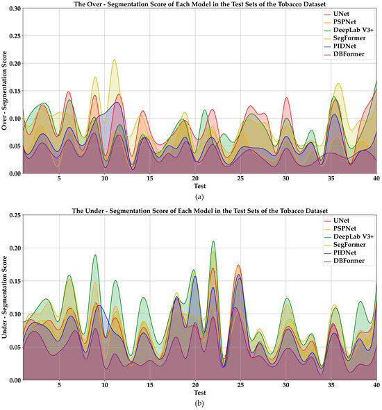 - High Accuracy and Stable Segmentation Performance: Experiments on both the Tobacco Dataset and the Sunflower Dataset demonstrate that the complete DBFormer model achieves outstanding performance in terms of Precision, Pixel Accuracy, mIoU, and Recall, while also exhibiting low Over-segmentation and Under-segmentation scores. These results validate the model’s ability to maintain stable and precise segmentation in complex backgrounds, confirming its application value in precision agriculture remote sensing image segmentation.