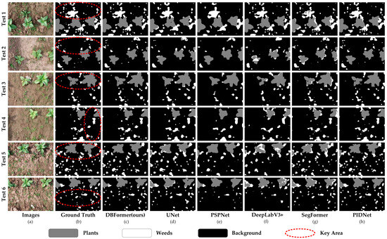 In addition, the Edge-Aware Loss function is introduced to further refine object boundaries, improving segmentation precision in complex weed–crop scenarios. The proposed DBFormer achieves significant improvements over baseline models, not just in numerical metrics, but also in visual segmentation quality and boundary clarity, as demonstrated in ablation and visualization experiments.