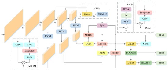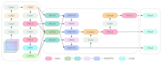 Given the diminutive size and limited informational content of small objects, backbone networks struggle to capture their discriminative features. To address this, we propose the Depth-wise Separable Aggregation (DSCA) network in the deeper layers of the backbone, enhancing semantic depth and foundational feature extraction capabilities. Concurrently, we introduce the LDSK within the backbone’s feature extraction pipeline to expand the effective receptive field. The processed features from three distinct scales are then propagated to the neck network. Recognizing the pronounced scale variability of targets in remote sensing imagery, we observe that conventional neck designs inadequately leverage contextual guidance for multi-scale feature fusion, limiting spatial fidelity. The MFRFPN is proposed within the neck to resolve this issue through enhanced spatial feature reconstruction and multi-scale context aggregation. Additionally, the Partial Depth-wise Context Aggregation (PDCA) network is integrated to strengthen global perception of multi-scale targets. These innovations synergistically mitigate information degradation during feature transmission while enriching spatial–semantic representations and enabling more effective cross-scale integration. Further addressing the challenge of spatial sensitivity in small object detection—where complex background interference frequently introduces localization noise—we implement a hybrid loss training strategy that reduces IoU metric sensitivity to positional deviations. This approach suppresses background interference through adaptive weighting of localization confidence and semantic discriminability, ultimately enhancing overall detection robustness.