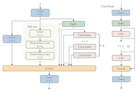 DSCA combines three convolutional variants—1 × 1 bypass convolution for channel-wise feature recalibration, DSConv for efficient spatial processing, and the C3K2 module for enhanced hierarchical integration—to improve the information flow. This integration generates a more diverse and enriched gradient flow during training, significantly enhancing the semantic depth of foundational features while effectively enriching contextual information. We apply batch normalization (BN) after each Conv operation in the DSCA module to maintain feature diversity and achieve lower latency. BN can be merged into adjacent Conv layers, stabilizing training and improving inference efficiency. This is crucial for ensuring compatibility among multi-branch convolutional paths and maintaining inter-layer gradient flow. The method BN is applied. A notable advantage of BN is its capability to be incorporated into nearby convolutional layers, leading to improved inference efficiency. The DSCA architecture is formulated as follows: