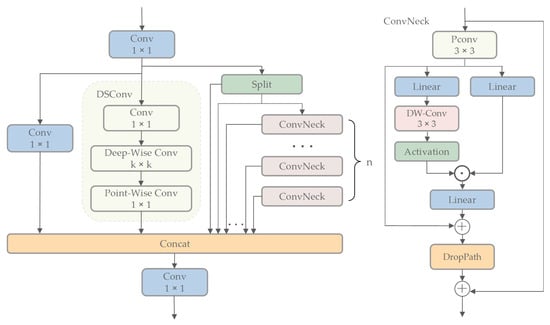 The MBA is designed in this paper. Multiple convolutional variants such as bypass convolution and depth-wise separable convolution (DSConv) are synergistically integrated into the deeper layers of the backbone network. In the neck network, we further combined convolutional operations with gating mechanisms. This design effectively enhances the diversity of visual features and improves information flow, thereby strengthening the network’s ability to model dense spatial transformations and mitigating the challenges caused by insufficient object information;