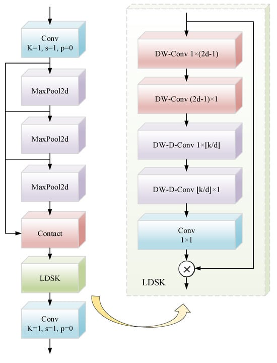 The SPPF module undertakes the tasks of feature extraction and encoding at multiple scales. This enables the integration of multi-scale features, with the aim of enhancing the semantic representations of feature maps. To enhance the architecture’s feature augmentation capability, we proposed LDSK, as depicted in