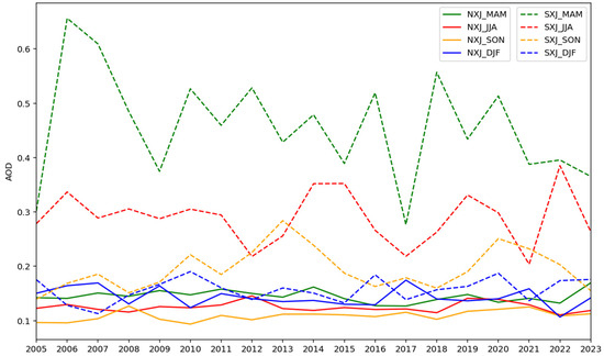 The AOD time series of the four seasons in southern and northern Xinjiang from 2005 to 2023.