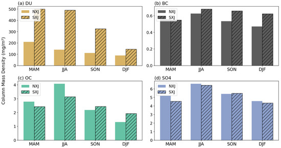 Seasonal column mass density of major aerosol components in Xinjiang.