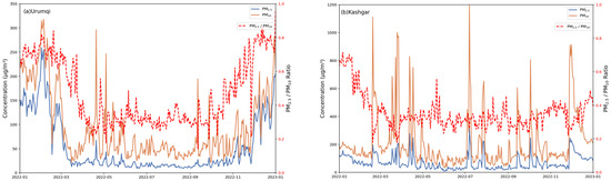 Time series of PM2.5, PM10, and PM2.5/PM10 Ratio in Urumqi and Kashgar (2022).
