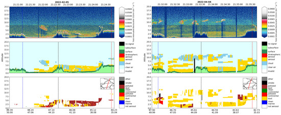 CALIPSO 532 nm total attenuation backscattering coefficient, vertical characteristic mask, and aerosol type (UTC) for 5 February 2022 (left) and 4 April 2022 (right). The blue, black, and red dashed lines represent the intersections of the satellite trajectory with the northern boundary of NXJ, the boundary between northern and southern Xinjiang, and the southern boundary of SXJ, respectively.