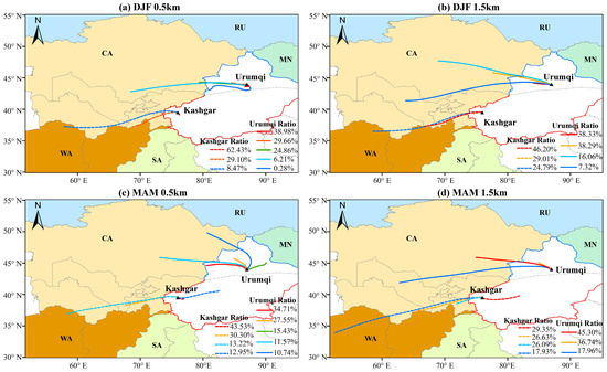 During spring, 500 m air masses over Urumqi were again dominated by local sources (77.69%), with the rest coming from eastern Central Asia. In Kashgar, 56.48% of the air masses were local, while 12.95% were traced to the Taklamakan Desert—an origin not observed in winter—and the remainder were from northern West Asia and southern Central Asia. At 1500 m altitude in spring, the air mass transport range expanded. Over Urumqi, the proportion of local trajectories dropped to 36.74%, with the remainder mainly from Central Asia. In Kashgar, only one trajectory cluster was of local origin (29.35%), while the others originated from West Asia, northern Central Asia, and regions in Central Asia adjacent to Kashgar. Overall, the analysis indicates that lower-altitude air masses (500 m) in both spring and winter exhibit strong local characteristics, whereas higher-altitude air masses (1500 m) are more significantly influenced by long-range transport.