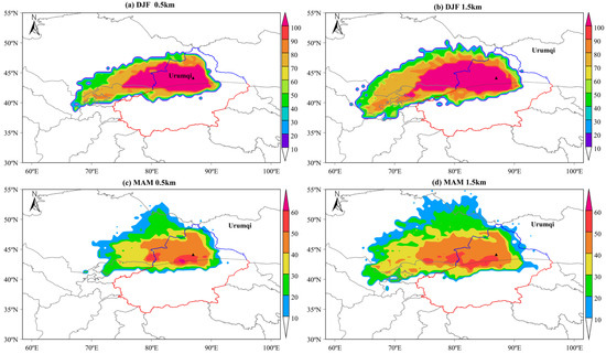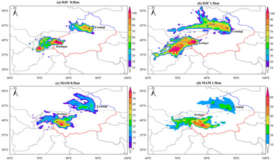 During spring, overall CWT values were lower than in winter, indicating a reduced level of regional pollution. In Urumqi, high-value areas became more spatially concentrated, suggesting a more localized impact from pollution sources. In contrast, Kashgar showed an emerging trend of potential sources expanding toward the Taklamakan Desert, particularly at the 1500 m level, where the influence of elevated layers became more pronounced. These results highlight distinct seasonal and vertical differences in the spatial patterns of potential aerosol source regions, emphasizing the stronger role of long-range transport in winter and at higher altitudes, especially for SXJ.