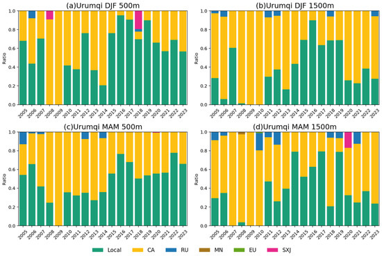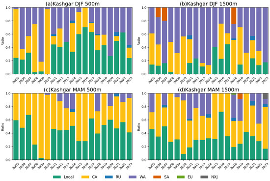 To further explore the long-term evolution of aerosol transport over Xinjiang, a systematic analysis of air mass trajectories and source region distributions from 2005 to 2023 was conducted (Figure 10 and Figure 11). During winter, air masses arriving in Urumqi predominantly originated from local and Central Asian regions, with fewer trajectories traced to Russia and SXJ. Notably, no air masses originated from local sources in 2008 and 2009; in 2008, a small number were traced to SXJ, whereas in 2009, all trajectories originated from Central Asia. Overall, the distribution of source regions showed no significant interannual variation. At 1500 m, the origin characteristics of air masses changed markedly: the proportion of locally sourced air masses decreased significantly, while those from Central Asia increased. In spring, compared with winter, the share of local air masses further declined, and trajectories at 1500 m showed expanded source regions, including Mongolia and Europe. Overall, with increasing altitude, the contribution from local sources diminished, whereas the influence of long-range transport became more prominent. The analysis of air mass origins over Kashgar during winter indicates that they primarily originated from local regions, Central Asia, and West Asia. At 500 m, the proportion of locally sourced air masses remained low before 2010, but increased significantly thereafter, accompanied by a rise in the contribution from West Asia. At 1500 m, air masses from South Asia appeared among the source regions, while those from West Asia became dominant and the share of local air masses declined. During spring, Kashgar’s air masses were mainly sourced from local areas and Central Asia, with a reduced proportion from West Asia. Similar to the pattern observed in Urumqi, an increase in trajectory altitude led to a lower contribution from local sources.