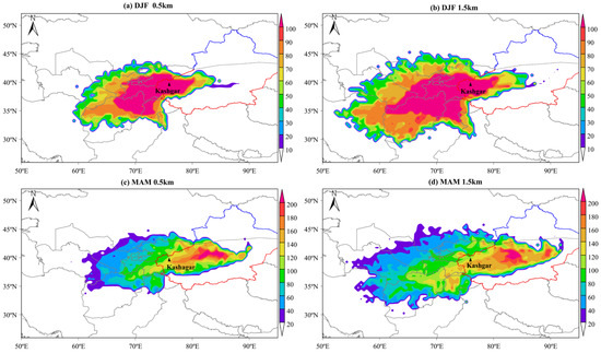 PM2.5 and PM10 are commonly used indicators of ground-level aerosol mass concentrations and effectively reflect variations in near-surface aerosol levels. To a certain extent, they serve as representative parameters for assessing changes in surface aerosol loading and are widely applied in air quality evaluations as well as comparative analyses with satellite-derived retrievals [49]. The spatial distribution characteristics of PM2.5 and PM10 closely resemble those of AOD (Figure S2 in the Supplementary Materials). During spring, summer, and autumn, PM2.5 concentrations in SXJ remain consistently high. In winter, however, a notable increase in PM2.5 is observed in NXJ, particularly in urban areas such as Urumqi, while the overall concentrations in SXJ are relatively low, with elevated values only in localized areas such as the western Taklamakan Desert and the city of Kashgar. In contrast, PM10 concentrations in SXJ are generally high throughout all seasons, and in winter, elevated PM10 levels are also observed in northern cities including Urumqi.
