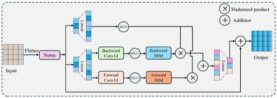 Detailed architecture of Vision Mamba.The framework primarily consists of bidirectional (forward–backward) state space models, linear layers, and residual connections, achieving global contextual modeling with linear computational complexity.
