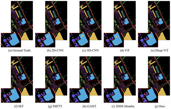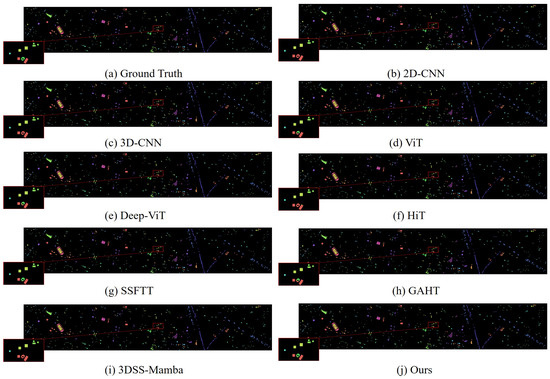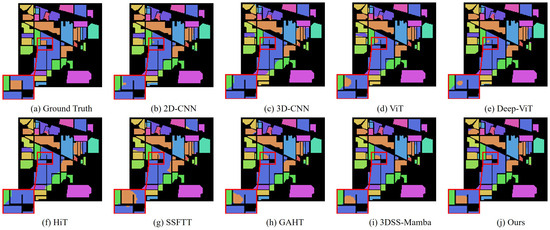 To validate the proposed method, we benchmark against a diverse set of state-of-the-art classification networks spanning CNN, Transformer, and Mamba architectures: 2D-CNN [46], 3D-CNN [47], ViT [48], Deep-ViT [49], HiT [20], SSFTT [39], GAHT [24], DCTN [41], MambaHSI [50] and 3DSS-Mamba [44].