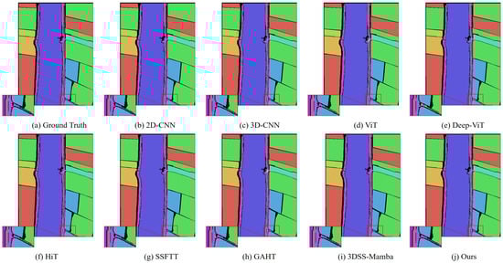 In addition, we compared MRFP-Mamba with several Transformer-based state-of-the-art models, including ViT, DeepViT, HiT, SSFTT, and GAHT. The experimental results show that MRFP-Mamba consistently outperforms these methods across various evaluation metrics, further highlighting its competitiveness in HSI classification tasks. In the visualized classification maps shown in Figure 3, Figure 4, Figure 5 and Figure 6, MRFP-Mamba produces results with clearer boundaries, finer detail restoration, and stronger spatial consistency compared to the other models. These improvements can be attributed to the synergy between its multi-receptive field convolution module, which captures multi-scale spatial features, and the Vision Mamba, which excels at modeling contextual dependencies.