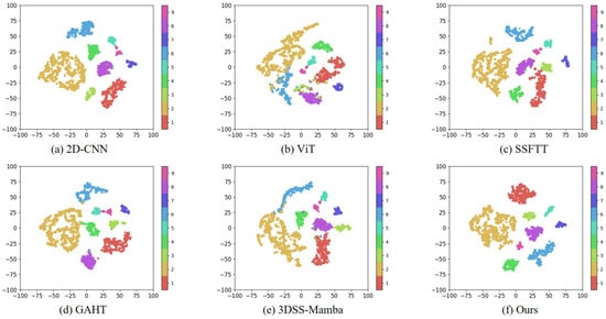 To further evaluate the model’s discriminative capability, we conducted a t-SNE visualization on the PaviaU dataset (as illustrated in Figure 7), comparing MRFP-Mamba with 2D-CNN, ViT, DeepViT, HiT, SSFTT, GAHT, DCTN, MambaHSI, and 3DSS-Mamba. The results show that MRFP-Mamba produces more compact and better separated class clusters in the feature space, significantly reducing inter-class confusion while enhancing intra-class cohesion. In contrast, 2D-CNN and 3DSS-Mamba display more dispersed and overlapping class distributions, indicating suboptimal performance in extracting either local or global features. Benefiting from the collaborative design of multi-receptive field convolutions and the parallel Vision Mamba, MRFP-Mamba achieves effective multi-scale spatial modeling and efficient long-range dependency capture, demonstrating superior accuracy and visual representation. Collectively, these findings underscore that developing a model capable of effectively integrating local and global features through a compact and efficient architecture is key to advancing the state of the art in hyperspectral image classification.