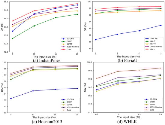 We conducted a systematic series of experiments on four representative hyperspectral image (HSI) datasets, examining the impact of varying training sample sizes. As illustrated in Figure 8, a clear upward trend in Overall Accuracy (OA) is observed as the number of training samples increases. This trend indicates that larger training sets significantly enhance the model’s discriminative capacity, particularly in distinguishing between different classes and reducing random misclassifications. These findings highlight the positive influence of expanded training data on the classification accuracy and robustness of the proposed method and further underscore the critical role of data scale in optimizing the performance of deep learning models.