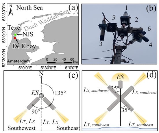 We utilized a time series of above-water hyperspectral measurements spanning from 2006 to 2023 at the Royal Netherlands Institute for Sea Research (NIOZ) jetty station (NJS) located near the Marsdiep tidal inlet of the Dutch Wadden Sea (Figure 1a). NJS has been equipped with a set of 6 TRIOS-RAMSES radiometers, comprising 1 Ramses-ACC for measuring solar downwelling irradiance (Ed, mW m−2 nm−1), 1 Ramses ACC-UV for measuring solar downwelling irradiance in the ultraviolet region (ES-UV, mW m−2 nm−1), 2 pairs of Ramses-ARC for measuring sky radiance (LS, mW m−2 nm−1 sr−1), and total upwelling radiance from water surface (LT, mW m−2 nm−1 sr−1). The spectral data was recorded every 10 min at 1 nm intervals, ranging from 350 nm to 950 nm. The ARC sensors were mounted with fixed viewing angle θV = 35° and direction φV = 135° (south-east) and φV = 225° (south-west) (Figure 1b–d), following the optimized method recommended by [4]. All radiometric measurements were acquired using standard cosine collectors and factory-supplied optics. A set of quality control tests was applied to the hyperspectral data to flag the invalid or suspicious spectra [41]. The quality-controlled flagged spectra were excluded from further analysis. In this study, we used the quality-controlled Ed(λ), LS(λ), and LT(λ) covering 6:00 AM to 6:00 PM (UTC).