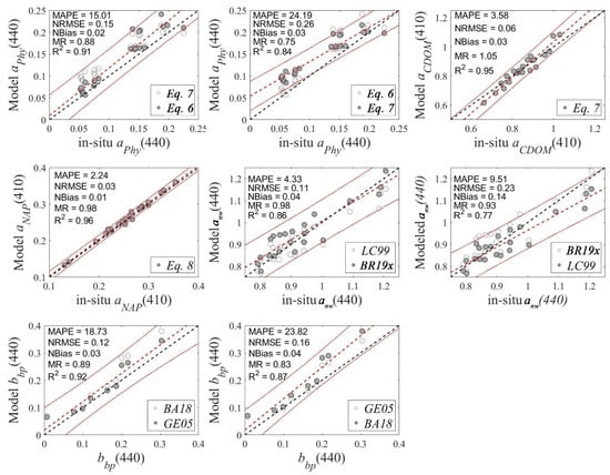 To evaluate the variability of IOPs, the 440 nm normalized IOPs are used to avoid the seasonal variabilities of these parameters (please see Supplement Section S2, Figure S5, and Table S1). Accordingly, the normalized aPhy(λ) shows low variability (CV = 0.05 at 410 nm and CV = 0.03 at 675 nm), indicating the normalized variability of phytoplankton remains relatively consistent during the measurements. The normalized aCDOM(λ) shows low values of CV ranging from 0.04 to 0.08 at 410 nm and 675 nm. Similarly, the normalized aNAP(λ) spectra show a low variability with CV = 0.02 at 410 nm and CV = 0.04 at 675 nm. As a result, the mean values of a*Phy(λ), aCDOM(λ2), aNAP(λ), SCDOM, and SNAP are used for parametrization of the absorption models in Equations (6), (8), and (9) (Table 1). Moreover, the mean values of b*SPM(λ) = bSPM(λ)/[SPM] m2 g−1 are used for the parametrization of the NAP backscattering coefficient (Equation (12)). Figure 2 shows the correlations between the measured and estimated absorption and backscattering coefficients. The values of MAPE, NRMSE, NBias, MR, and R2 of aPhy(λ) from Equations (6) and (7) against in-situ measurements are 15.0–24.2%, 0.15–0.26, 0.02–0.03, 0.88–0.75, and 0.91–0.84, respectively. The measured aPhy(λ) spectra exhibit more consistency with the spectra calculated from Equation (6) than Equation (7). The exponential fits of aCDOM(410) and aNAP(410) show very good consistency with measurements (MAPE ≤ 3.6%, NRMSE ≤ 0.06, NBias ≤ 0.03, MR ≅ 1.0, and R2 ≥ 0.95). The correlation between in-situ anw(440) and anw,BR19x(440) shows more consistency with measurements than anw,LC99(440) (MAPE = 4.3%, NRMSE = 0.11, NBias = 0.04, MR = 0.98, and R2 = 0.86). Therefore, parametrization of Equation (3) using ap,BR18x(λ) (Equation (6) + Equation (8) + Equation (9)) represents the optimum setup that correlates well with the in-situ measurements. Parametrization of bbp(λ) using bb,GE05(440) components shows more consistency than those by bb,BA18(440), with the values of MAPE = 18.8 and 23.8%, NRMSE = 0.12 and 0.16, NBias = 0.03 and 0.04, MR = 0.89 and 0.83, and R2 = 0.92 and 0.87, respectively. All estimated IOPs fall within the boundaries of the 95% confidence level of the measurements.