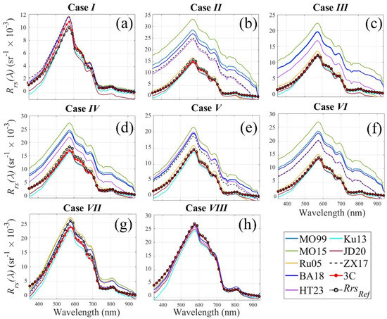 - Case VIII, High sun-zenith angle (Figure 3h and Figure 4h). All methods show low variabilities. Apart from the 3C, the other methods underestimate the Rrs(λ) spectra in the blue-NIR regions. The MO99, MO15, Ru05, BA18, HT23, and JD20 show relatively similar performance with Total Score = 0.81–0.84, MAPE = 11.6–15.1%, UPD = −1.2–4.6, and NRMSE = 30.1–32.4%. The Ku13 shows a very weak performance in the blue region with a Total Score of 0.36. The 3C model shows the best performance in this case with Total Score = 0.92, MAPE = 5.2%, UPD = 0.92, and NRMSE = 22.7%. The ZX17 is not available for this case.