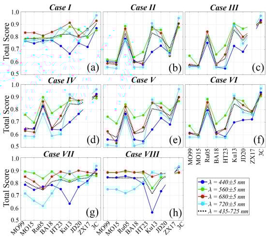 Statistical Total Scores comparing modeled Rrs(λ) with reference Rrs,ref(λ) spectra for eight environmental conditions (Cases I–Case VIII). Case definitions are consistent with Figure 3.
