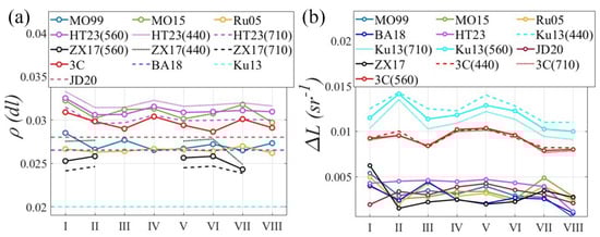 The models, which result in a wavelength-independent ΔL, exhibit low (≤0.005 sr−1) and relatively uniform ΔL variations in all conditions (Figure 5b). In contrast, the models with wavelength-dependent ΔL (i.e., 3C and Ku13) exhibit higher and more variable ΔL in various conditions. The 3C model shows a wavelength-dependent ΔL with a minimum of 0.0080 sr−1 in Case-VIII and a maximum of 0.0102 sr−1 in Case-IV. The values of 3C-derived ΔL at the blue to NIR regions are very close to the average values (std ≤ 0.001 sr−1) in various conditions. The Ku13 model presents the wavelength-dependent ΔL with the extreme values of 0.0091 sr−1 for Case-VIII and 0.0141 sr−1 for Case-II. The ΔL values of Ku13 decrease from blue to NIR regions by an average of 0.0021 sr−1 in all conditions.