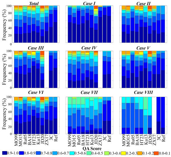 Comparisons of QA scores of the modeled Rrs(λ) spectra (N = 918) and Rrs,ref(λ) in various environmental conditions. The environmental conditions are illustrated in Table 4.