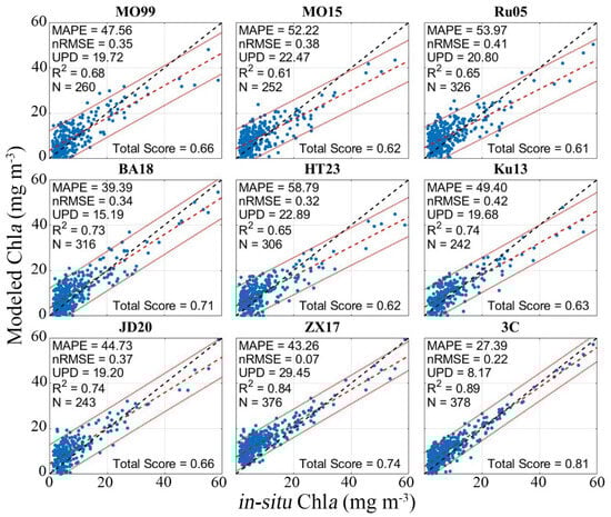 Comparison of in-situ and estimated Chla using different models of Rrs. The dotted-red lines and dashed red lines show the statistical confidence level of 95% and the linear trends, respectively. The dashed-black lines show the 1:1.