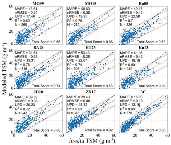 Comparison of in-situ and estimated TSM using different models of Rrs. Symbols are similar to those in Figure 7.