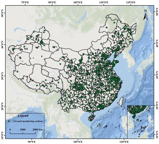 Due to factors such as satellite monitoring of atmospheric conditions and model estimation errors, the accuracy of remotely sensed PM2.5 concentration data (Dataset V5.GL.04) exhibits certain deviations compared to ground-based monitoring station measurements. Consequently, it is necessary to validate the accuracy of this dataset using ground station data. The ground station data employed in this study were obtained from the official website of the China National Environmental Monitoring Centre (CNEMC). These data comprise hourly PM2.5 concentration measurements from all stations across China for the period 2014–2021. As illustrated in Figure 1, the spatial distribution of monitoring stations is uneven, with a higher density observed in the eastern coastal regions and fewer stations distributed across the western areas.