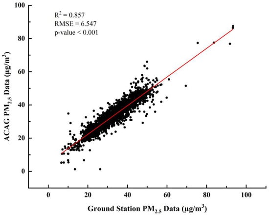 Utilizing the hourly PM2.5 concentration measurements from the monitoring stations, we computed the annual average PM2.5 concentration for each station using Python 3.11. Subsequently, a correlation analysis was performed between these ground-based station annual averages and the corresponding satellite-retrieved data (V5.GL.04). The results demonstrated a strong correlation, with an R2 of 0.857 and an RMSE of 6.547, and the analysis passed the significance test (Figure 2). This indicates that the satellite-retrieved dataset is suitable for subsequent analysis.