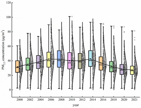 As illustrated in Figure 3, the PM2.5 concentration from 2000 to 2021 followed a trend consistent with a normal distribution, characterized by “bimodal” fluctuations and phased evolutionary patterns in the annual averages. However, significant variations were observed across different periods. From 2000 to 2007, China’s PM2.5 pollution levels continuously worsened, marked by a 35.02% increase in concentration. This phase was closely associated with the accelerated processes of industrialization and urbanization under the “Tenth Five-Year Plan” (2001–2005), during which rapid yet unregulated development resulted in ecological degradation and a marked decline in air quality [57]. For instance, energy-intensive industries such as steel and cement production expanded rapidly, contributing to a surge in coal consumption, while emission control technologies remained underdeveloped. Between 2007 and 2014, PM2.5 pollution did not improve, with a slight decline followed by a gradual intensification, peaking in 2014 at 42.6 µg/m3. This paradoxical trend can be attributed to two competing forces: (1) the 2008 global financial crisis temporarily reduced industrial output, leading to a short-term dip in PM2.5 emissions; and (2) China’s post-crisis economic stimulus package reignited energy-intensive sectors, particularly in the Beijing–Tianjin–Hebei (BTH), Yangtze River Delta (YRD), and Pearl River Delta (PRD) regions, where PM2.5 concentrations rebounded significantly due to intensified coal combustion and industrial activity [58]. From 2014 to 2021, a rapid decline in PM2.5 concentration occurred, dropping from 42.6 to 27.4 µg/m3. Evidently, 2014 marked a pivotal turning point in China’s PM2.5 pollution, with a transition from continuous deterioration to gradual improvement. This trend was primarily driven by stringent policy interventions but also influenced by extraordinary events such as the COVID-19 pandemic. In terms of regulatory efforts, the Chinese government enacted major air pollution control initiatives, including the “Air Pollution Prevention and Control Action Plan” and the “Three-Year Action Plan to Fight Air Pollution”, which contributed to a progressively notable improvement in PM2.5 pollution [59]. Simultaneously, the COVID-19 outbreak in late 2019 triggered unprecedented containment measures—including citywide lockdowns, the suspension of emission-intensive construction projects, the promotion of public transportation alternatives, and regulatory enforcement of emission reductions—which collectively enhanced air quality by suppressing anthropogenic emissions [60].