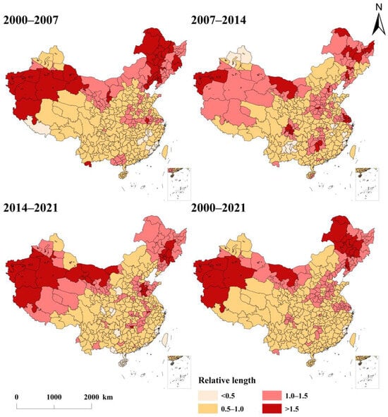 The geometric features of the LISA time path are utilized to delineate the local structure and spatio-temporal dependencies of PM2.5 pollution. As depicted in Figure 6, from 2000 to 2007, 130 cities exhibited a relative length exceeding 1, representing 34.9% of the total. This figure increased to 156 cities between 2007 and 2014, predominantly concentrated in northern regions, signaling a robust dynamic local spatial structure in PM2.5 concentration growth. However, from 2014 to 2021, the number of cities with a relative length greater than 1 declined. Apart from spatial clustering observed in the Northeast, Northwest, and Shandong Peninsula, the spatial structure of pollution in other regions remained relatively stable. Overall, the local spatial dynamics of PM2.5 pollution in Northern China from 2000 to 2021 were generally more prominent than in southern regions, particularly in the three northeastern provinces, the Northwest, and cities across the North China Plain. In the South, the most significant impacts were observed in the middle and lower reaches of the Yangtze River. This spatial disparity can be attributed to regional development patterns and the implementation of national strategies. In Northern China, greater reliance on coal-based energy systems for industrial production and winter heating, combined with the persistence of traditional energy-intensive industries, has delayed the transition to cleaner production modes, thereby amplifying pollution fluctuations. Concurrently, the execution of national strategies, such as the Northeast Revitalization, Western Development, and Rise of Central China, has reinforced traditional industrial structures, exacerbating environmental pollution during economic development [65]. In contrast, southern regions underwent earlier industrial upgrading and accelerated renewable energy deployment, resulting in more stable environmental dynamics.
