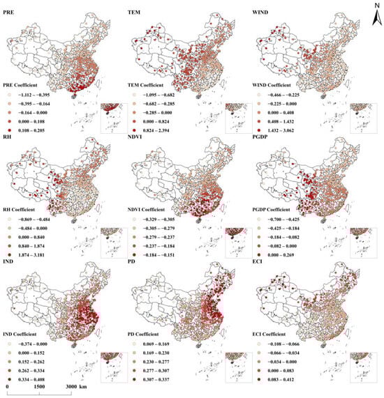 Regarding the factors influencing PM2.5, Cheng et al. [67] employed a spatial panel model to empirically analyze the key drivers of PM2.5 pollution across 285 Chinese cities. Their results indicate significant global spatial autocorrelation and local spatial clustering in urban haze pollution in China, along with a pronounced inverted U-shaped curve relationship between economic development level and air pollution—findings highly consistent with the conclusions of the present study. Furthermore, while Cheng et al. primarily focused on socioeconomic factors affecting PM2.5, this study provides a more comprehensive examination encompassing both natural environmental and socioeconomic factors. We also introduce GTWR to further elucidate the local spatio-temporal heterogeneity in the magnitude of influence exerted by various factors on PM2.5. Nevertheless, notable similarities exist, as both studies confirm that economic development level, energy intensity, and industrial structure exert a significantly positive influence on PM2.5 concentrations. Wang et al. [81] utilized GWR to explore the strength and direction of associations between various factors and PM2.5 in Chinese cities, incorporating landscape factors—an aspect not explicitly addressed in the current study. While GWR captures spatial non-stationarity in PM2.5 relationships by constructing spatially dependent local models, it neglects temporal non-stationarity and thus inadequately explains the spatio-temporal dynamics between influencing factors and PM2.5. Additionally, Wang et al. overlooked the spatial spillover effects of PM2.5, considering only the local-scale mechanisms of influence and consequently failing to account for cross-regional air pollution issues.