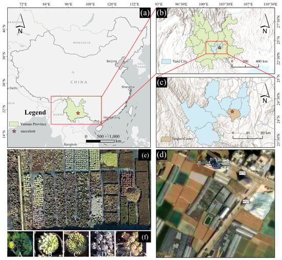 (a) Map showing Yunnan Province’s geographic position; (b) General view of Yuxi City; (c) Map highlighting Tonghai County’s position within Yuxi; (d) Schematic diagram of UAV-based imaging approaches (orthophoto image of the target area); (e) Sample panoramic image of succulent plants; (f) Diagram showing succulent classification. Six categories, including a miscellaneous group. The six categories were obtained through surveys of local farmers to determine the general classification range, and then classified manually based on the shape and length of the leaves.
