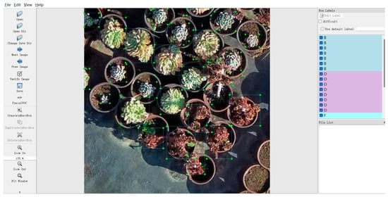 The UAV acquired high-resolution images at 600 × 600 pixels. The captured images were subsequently used to generate a panoramic visualization covering the full succulent planting region. To achieve this, the SIFT algorithm was adopted for stitching multiple image frames, as depicted in Figure 2d,e. Figure 2d is intended to show the orthophoto image of the target area obtained by the drone. Geometric distortion was corrected by using tie points generated through SIFT-like feature matching, followed by iterative bundle block adjustment (BBA), which refined internal and external camera parameters and distortion coefficients to minimize reprojection error. Orthorectification was performed using DEM or point cloud-based terrain elevation references to project corrected images onto a planar map, applying a parallel (orthogonal) projection into the WGS 84/UTM Zone 47N coordinate system. The integration process included identifying shared regions across successive frames, aligning consistent visual features, and combining them to form a seamless panoramic image of the succulent area. As shown in Figure 2f and Figure 3, the Labeling 1.8.1 tool was employed to manually annotate each plant type, with the annotated instances categorized into six categories. The annotated sections were subsequently cropped into high-resolution patches with dimensions of 600 × 600 pixels.